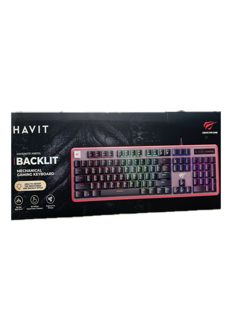 A Havit mechanical gaming keyboard built for fast, precise input with tactile switches and durable construction. It features responsive keys and gaming-ready performance, making it ideal for competitive play and extended typing sessions.